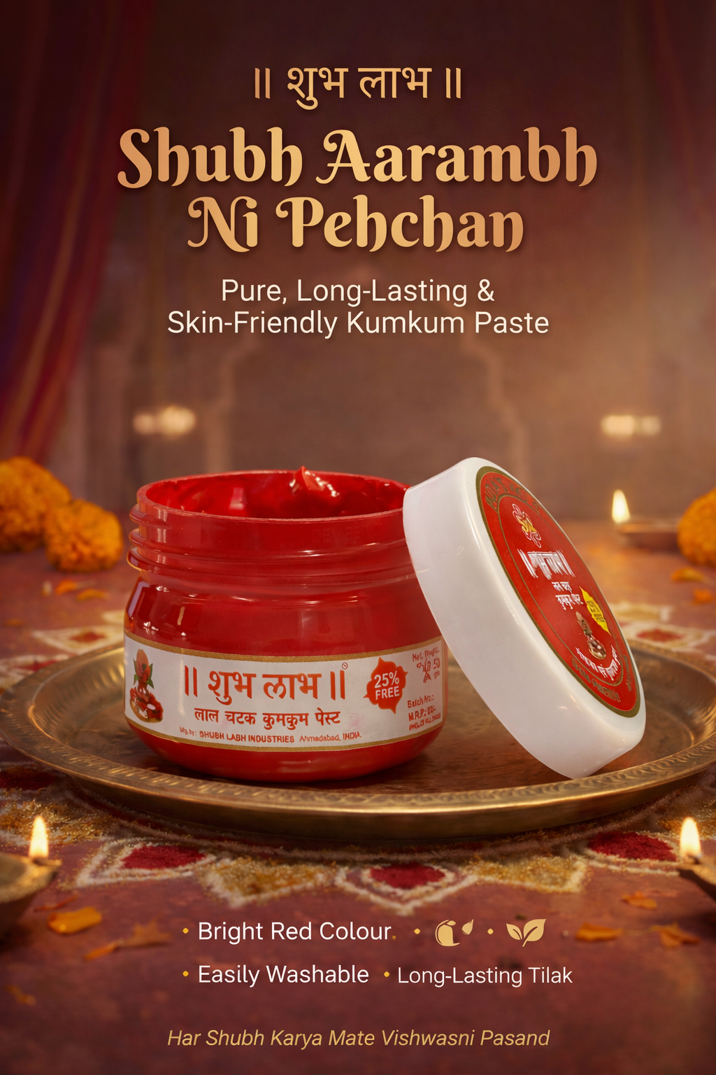 Lal Chatak Kumkum Paste is a premium-quality kumkum specially developed for daily pooja, tilak, and religious rituals. It delivers a rich and bright red color that stays fresh after application and reflects purity and devotion.